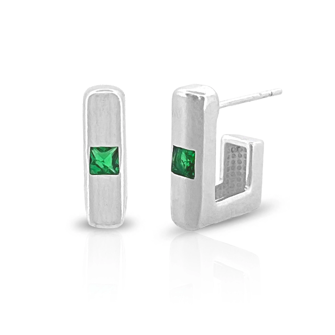 Brinco de Prata Leve Argola Retangular com Zircônia Esmeralda