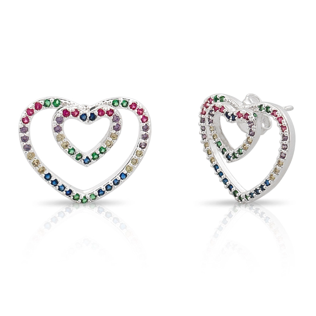 Brinco de Prata Leve Coração Duplo Com Zircônias Coloridas