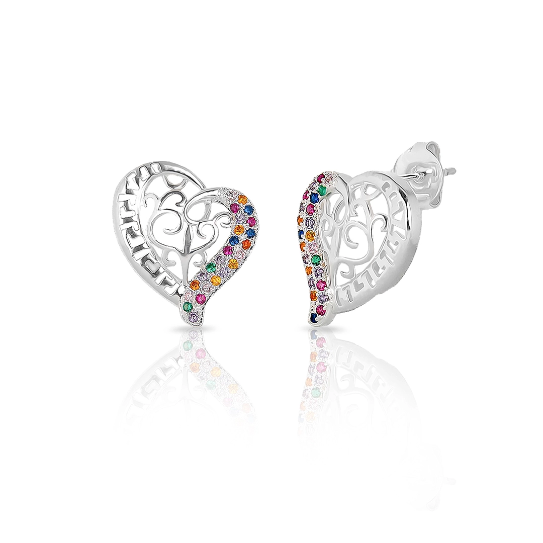 Brinco top coração estilizado com trabalhado vazado e zircônias coloridas.