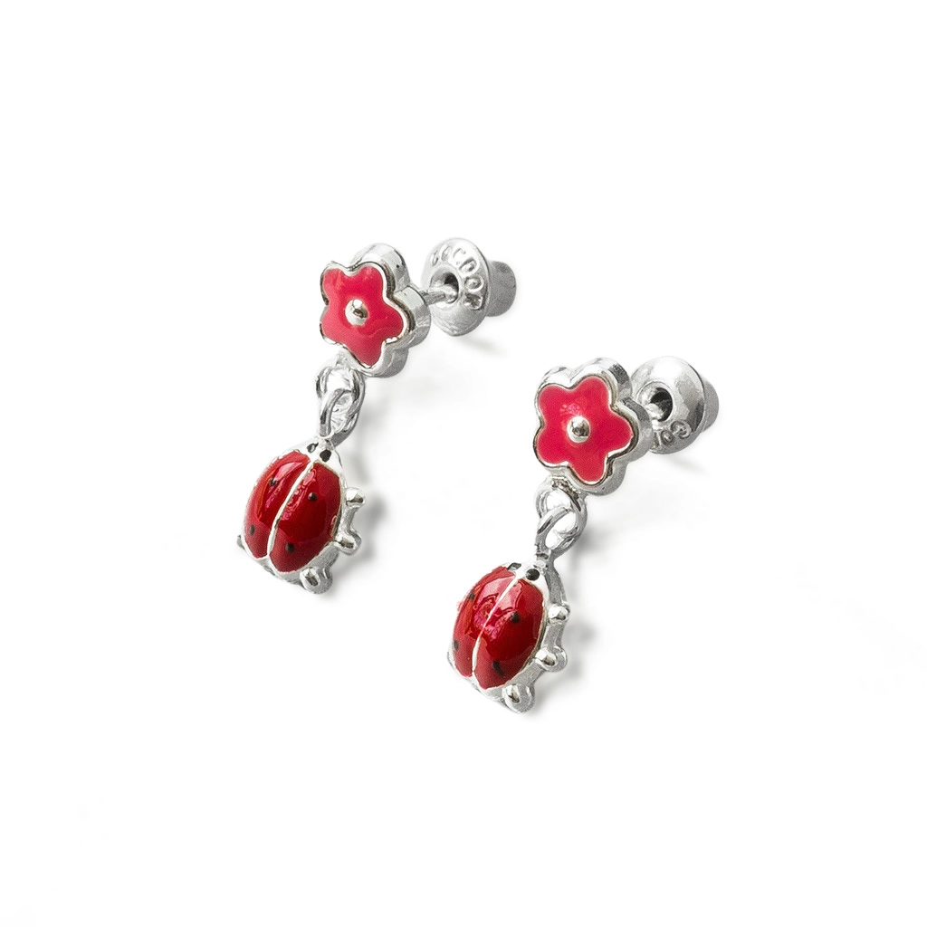 Brinco de Prata Leve Infantil Joaninha com Flor Esmaltada