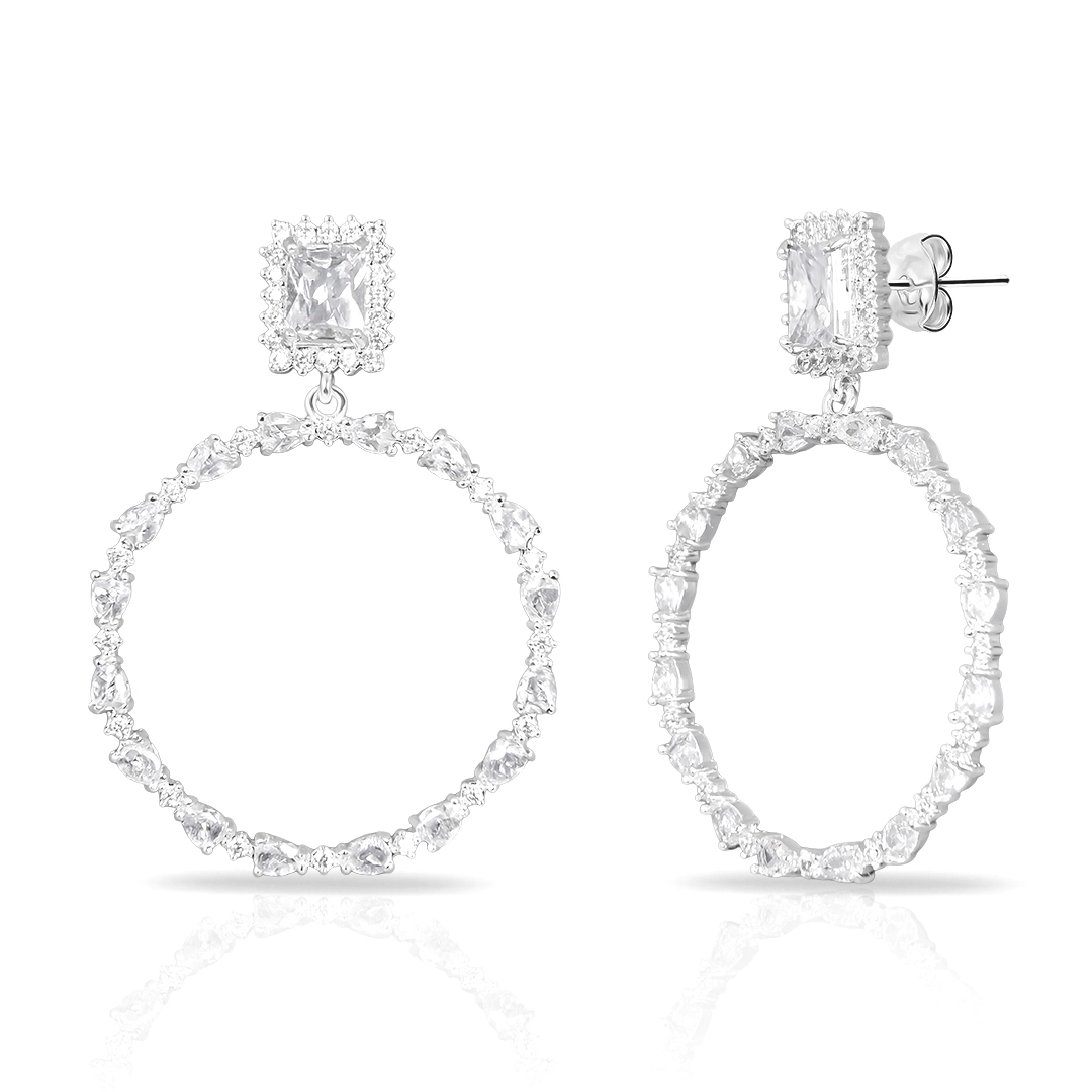 Brinco balanço com círculo e zircônias cristal nos formatos, retangular, redonda e gota.