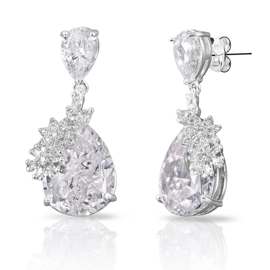 Brinco de Prata Leve Linha Festa Gota de Zircônia Cristal com Flores na Lateral