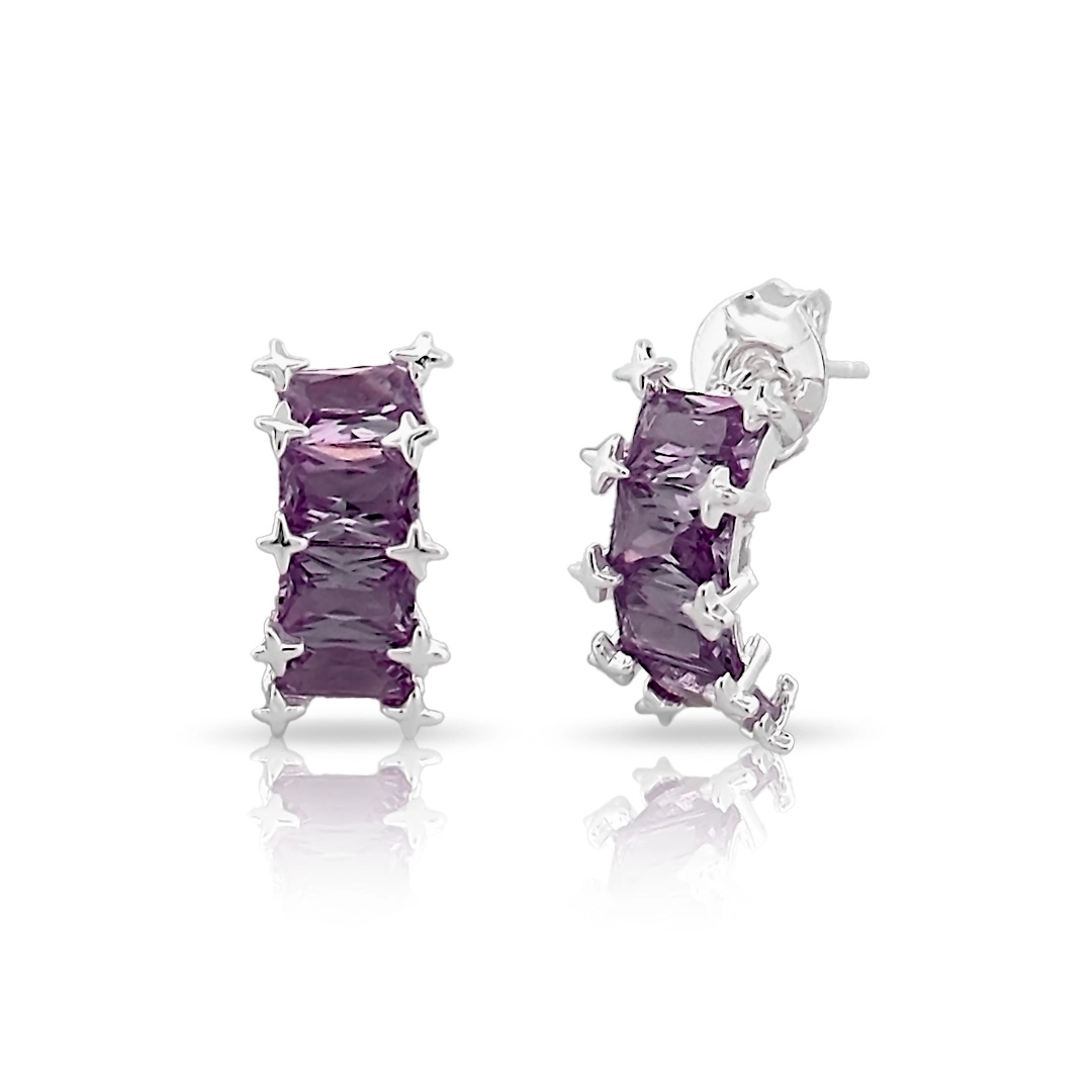 Brinco de Prata Leve Meia Argola com Zircônia Ametista Retangular