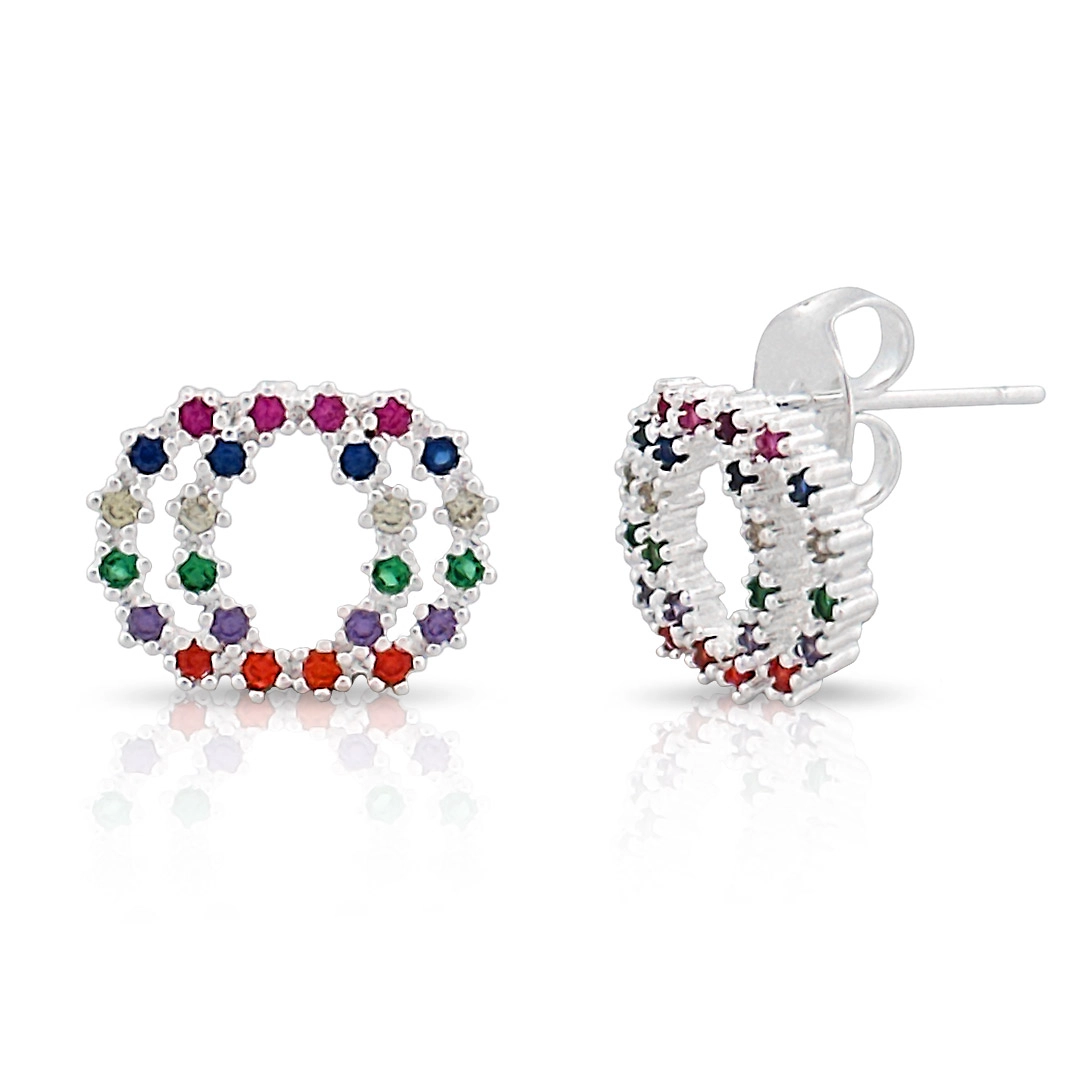 Brinco de Prata Leve Top Círculo Duplo Zircônias Coloridas