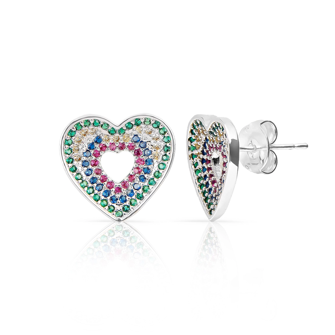 Brinco top formato de coração vazado com zircônias coloridas e tarraxa.
