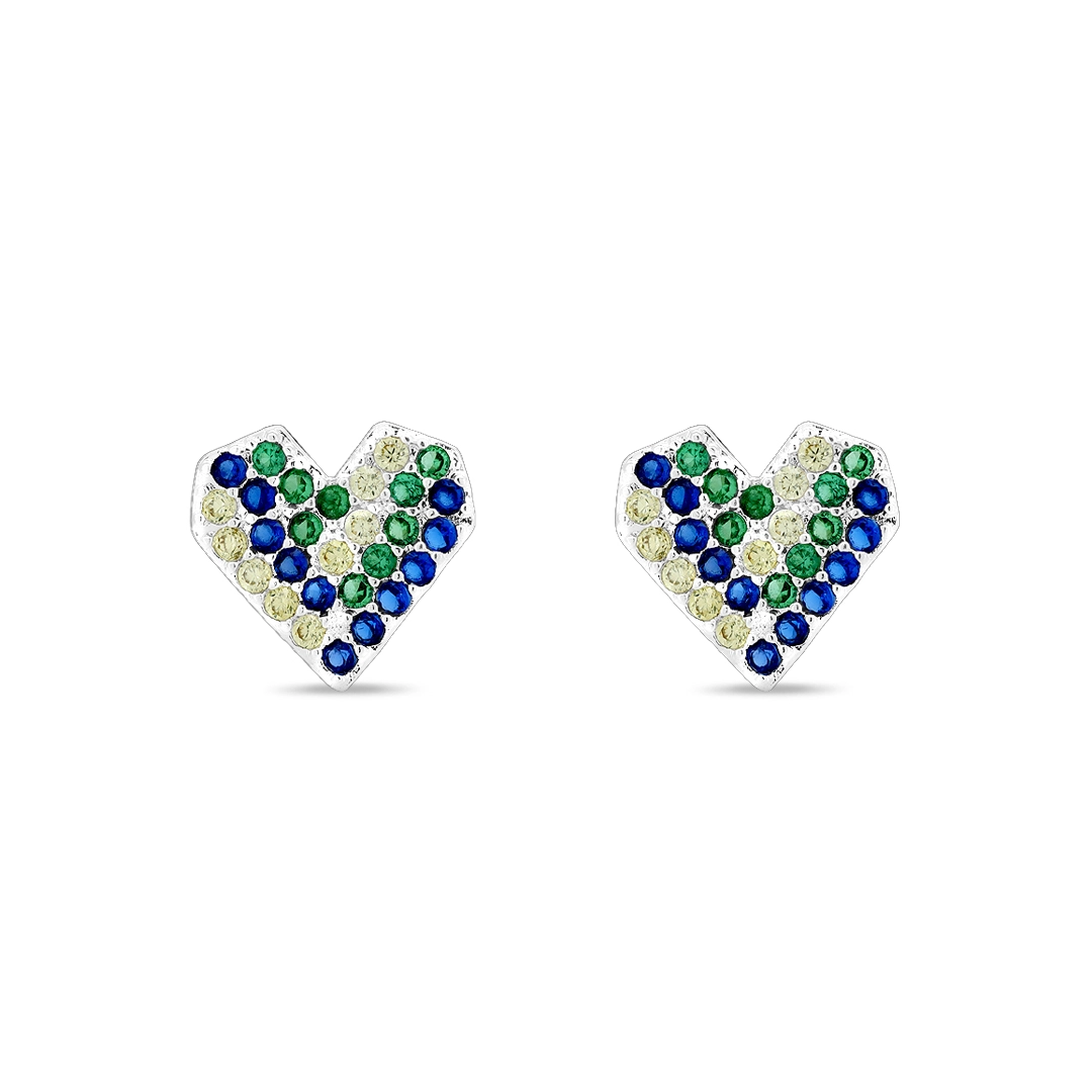 Brinco top em formato de coração com zircônias no tom verde, azul e amarelo.