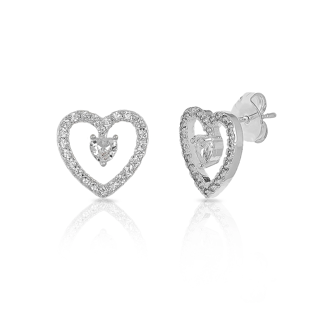 Brinco top formato de coração vazado, cravejado com zircônias cristal e tarraxa.