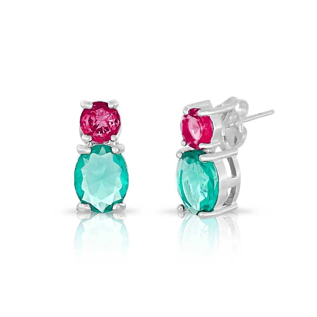 Brinco top duplo com zircônias oval esmeralda e rubi redonda.