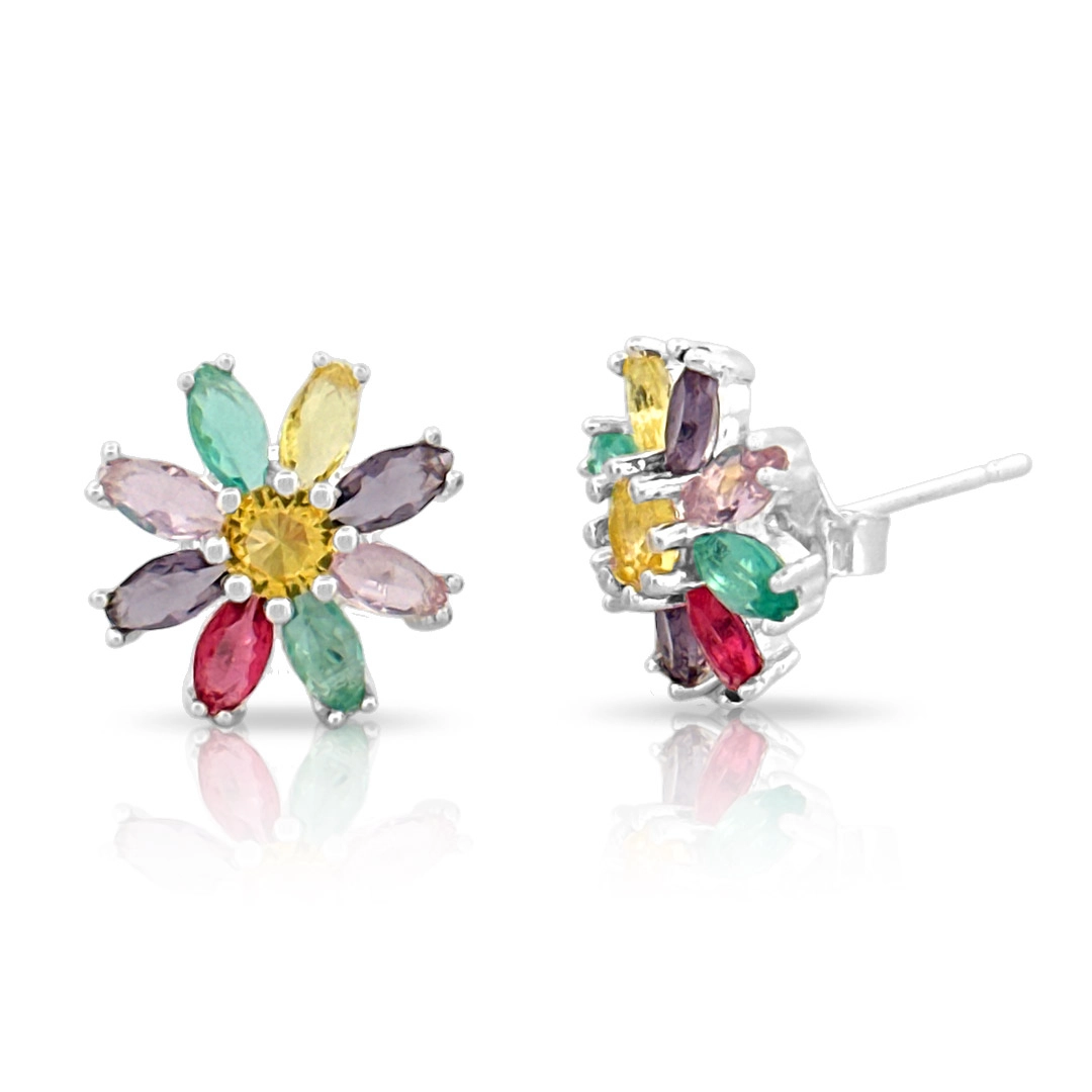 Brinco de Prata Leve Top Flor Com Zircônias Coloridas