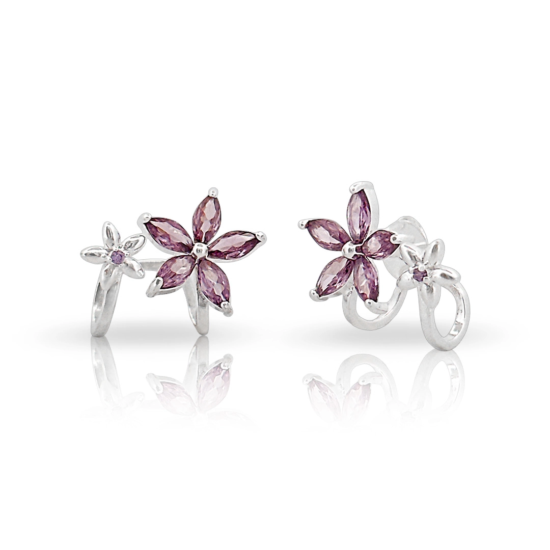 Brinco de Prata Leve Top Flor Dupla com Zircônia Ametista