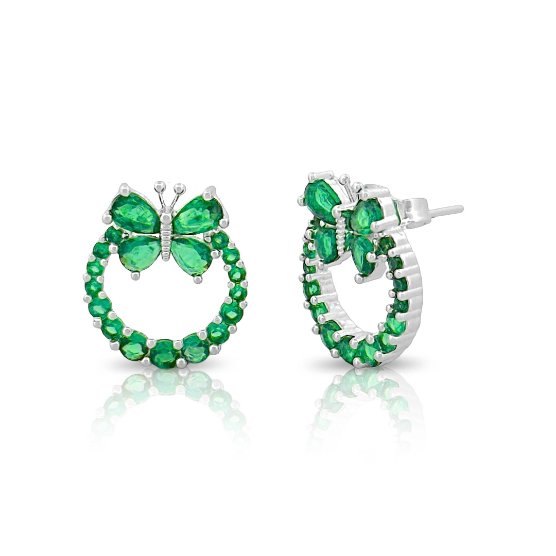 Brinco de Prata Leve Top Redondo Com Borboleta de Zircônias Esmeralda