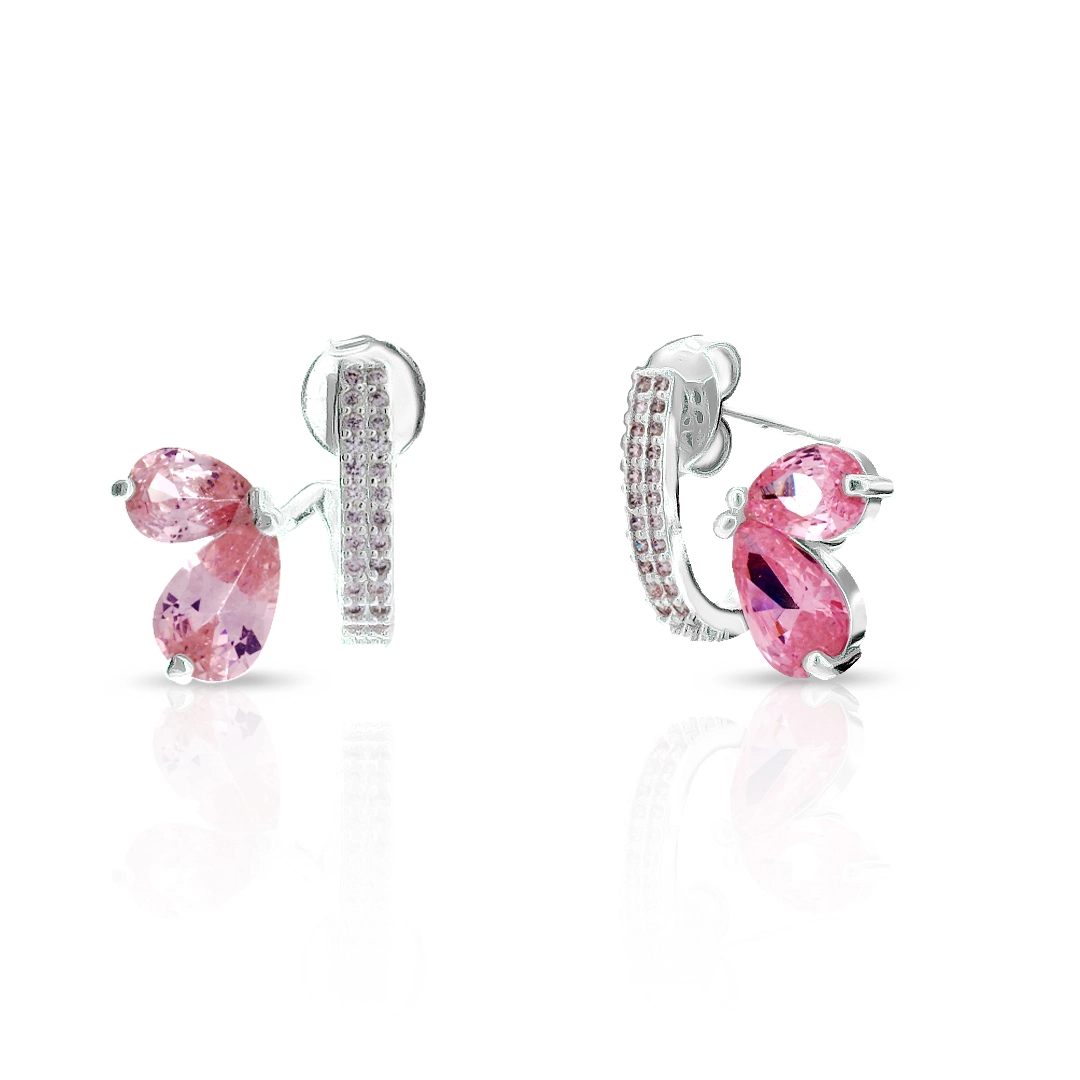 Brinco top trabalhado com zircônias rosa em formato gota e cravejadas.