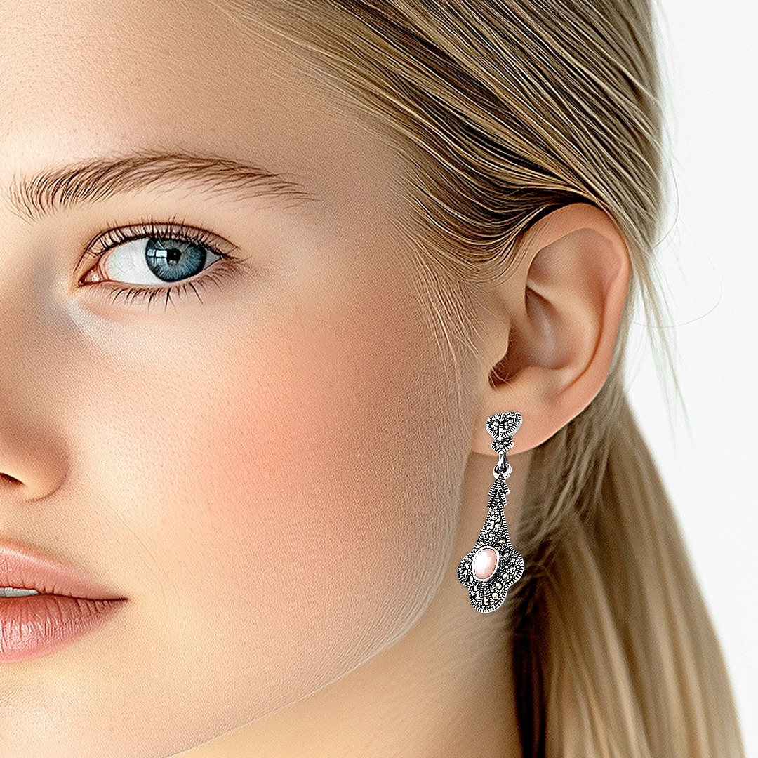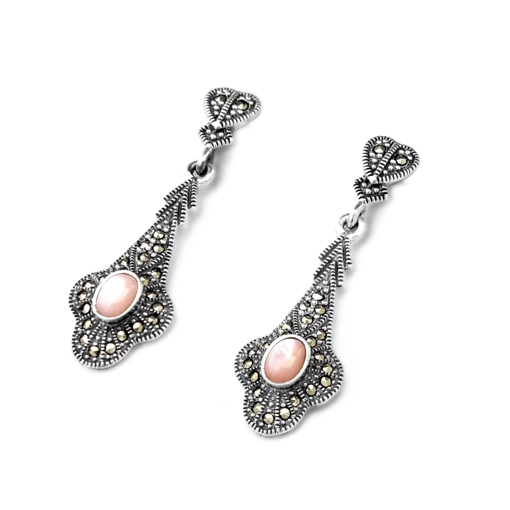 Brinco balanço longo com madrepérola rosa e marcassitas.