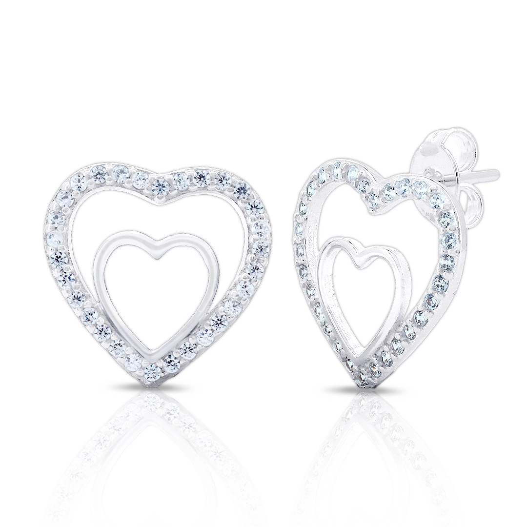 Brinco top de corações vazados sendo um espelhado e o outro com zircônias cravejadas.