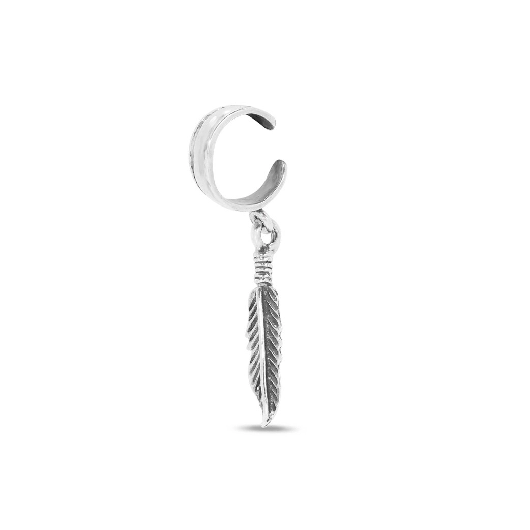 Brinco Ear Cuff de Prata com Pena Envelhecida