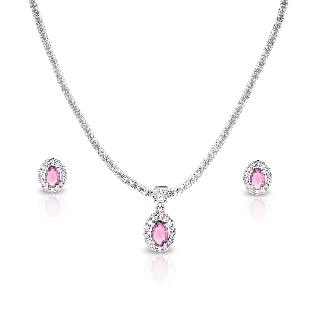 Colar riviera de zircônias cristal com pingente e brincos ovais de zircônia rosa.