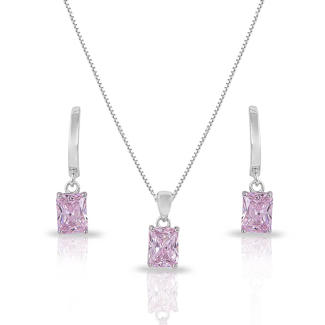 Colar Blend Collection de Prata 925 com Pingente e Brincos de Zircônia Rosa Retangular