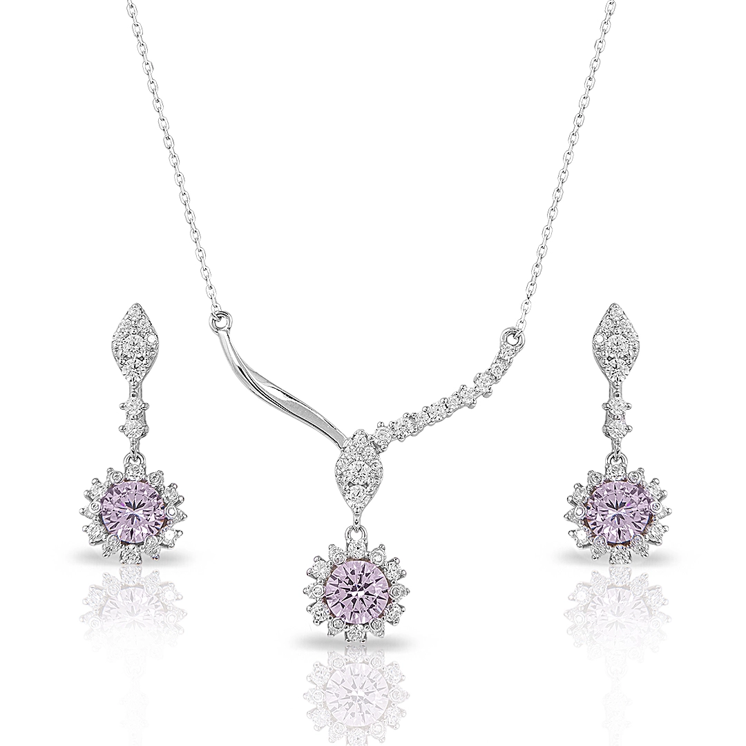 Colar Blend Collection de Prata 925 Trabalhado com Brincos de Zircônias Cristal e Rosa