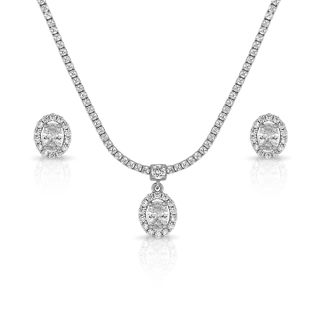 Colar riviera de zircônias cristal com pingente e brincos ovais.