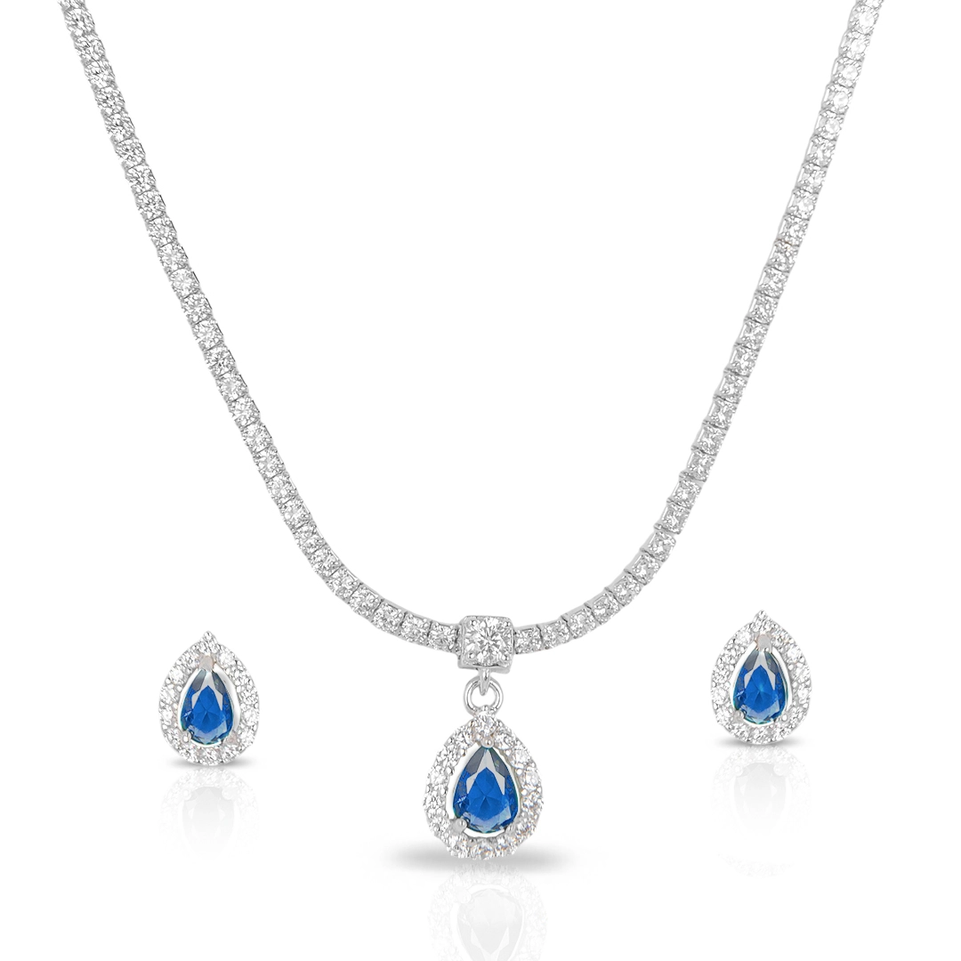 Colar riviera de zircônias cristal com pingente e brincos gota de zircônia safira.