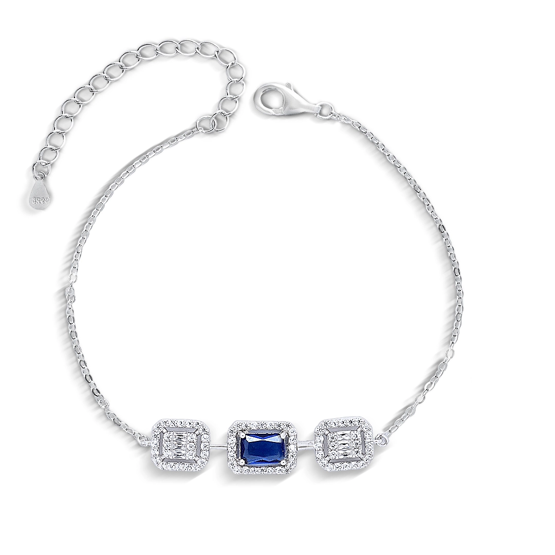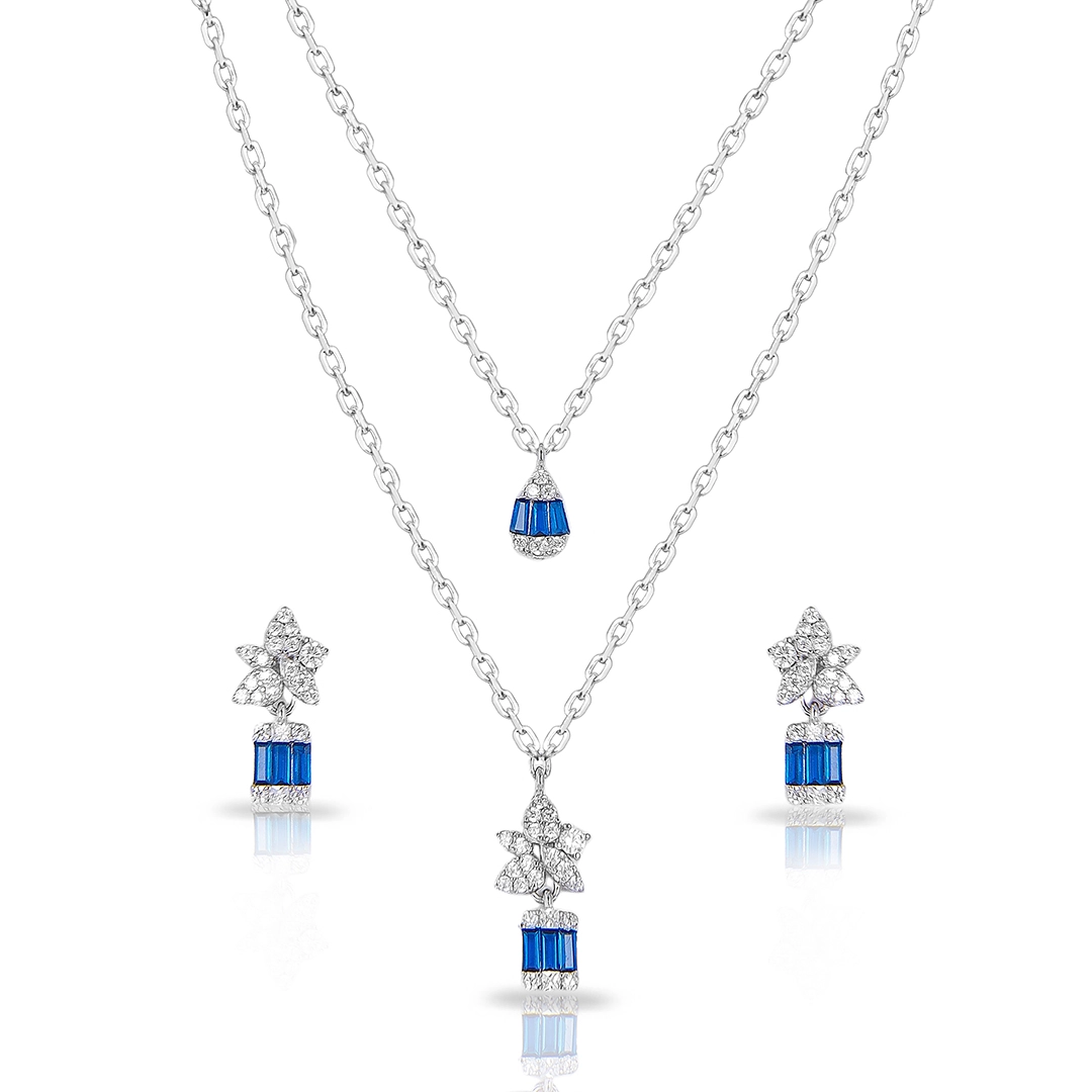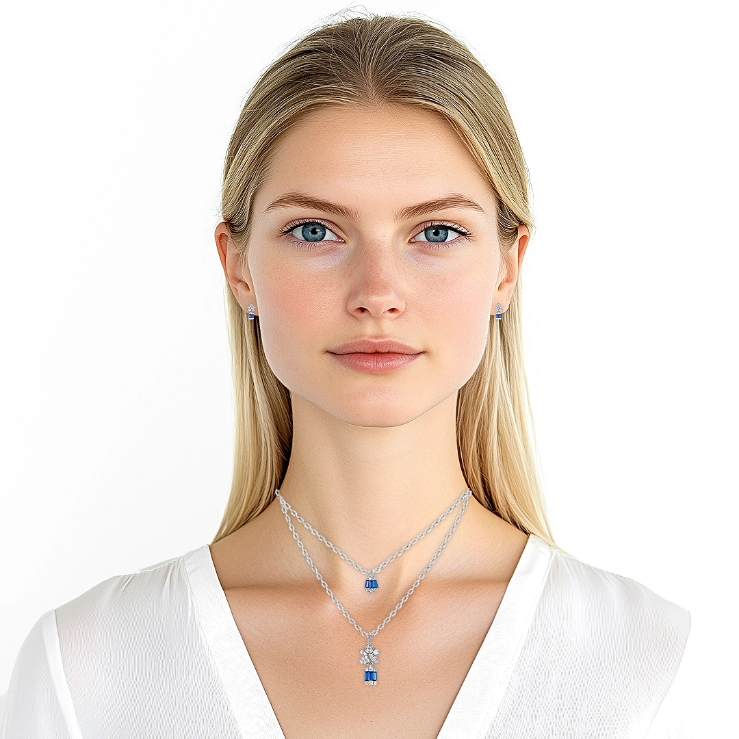 Colar de Prata Blend Collection Duplo com Brincos de Zircônias Cristal e Zircônia Safira Retangular
