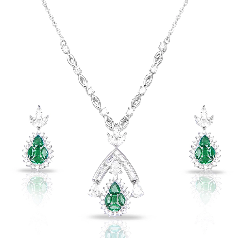 Colar de Prata Blend Collection e Brincos Trabalhados com Gotas em Zircônias Esmeralda e Cristal
