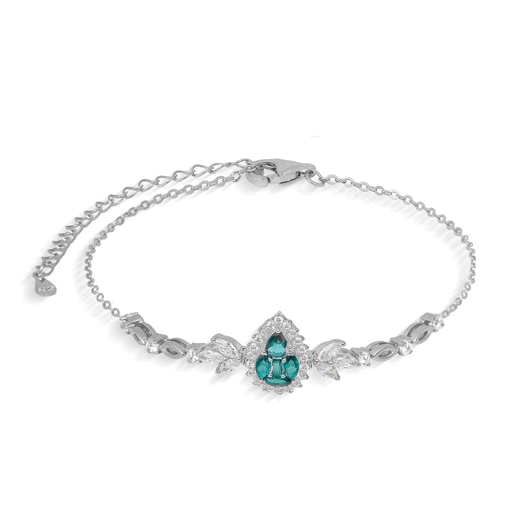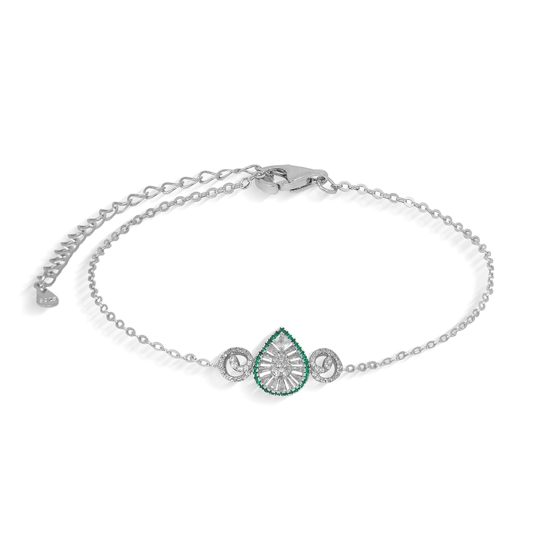 Colar trabalhado com malha de elos iguais e brincos em formato de gota com zircônias esmeralda e cristal.