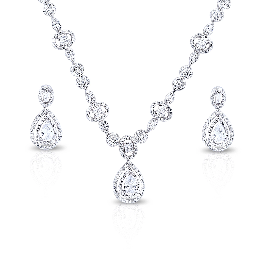 Colar trabalhado com malha de elos iguais e brincos em formato de gota em zircônias cristal.