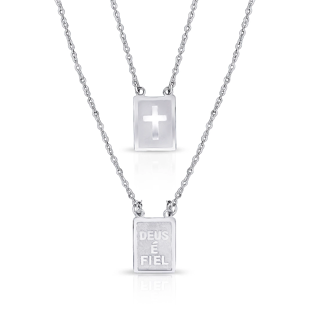 Escapulário com duas medalhas em formato retangular sendo uma de cruz e a outra com a escrita Deus é Fiel.