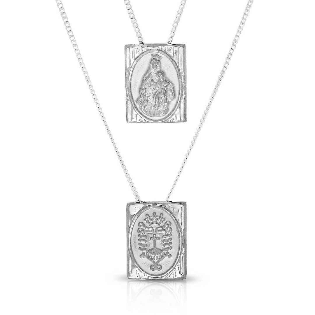Escapulário de Prata com Nossa Senhora do Carmo e Sagrado Coração de Jesus com Acabamento em Ródio
