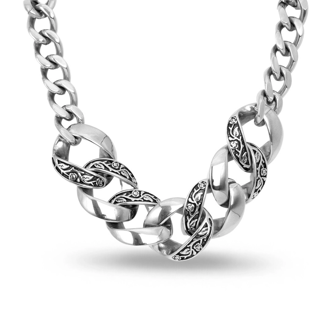 Gargantilha Choker de Aço Big Gourmette Elo Liso e Trabalhado com Resina Preta e Flor