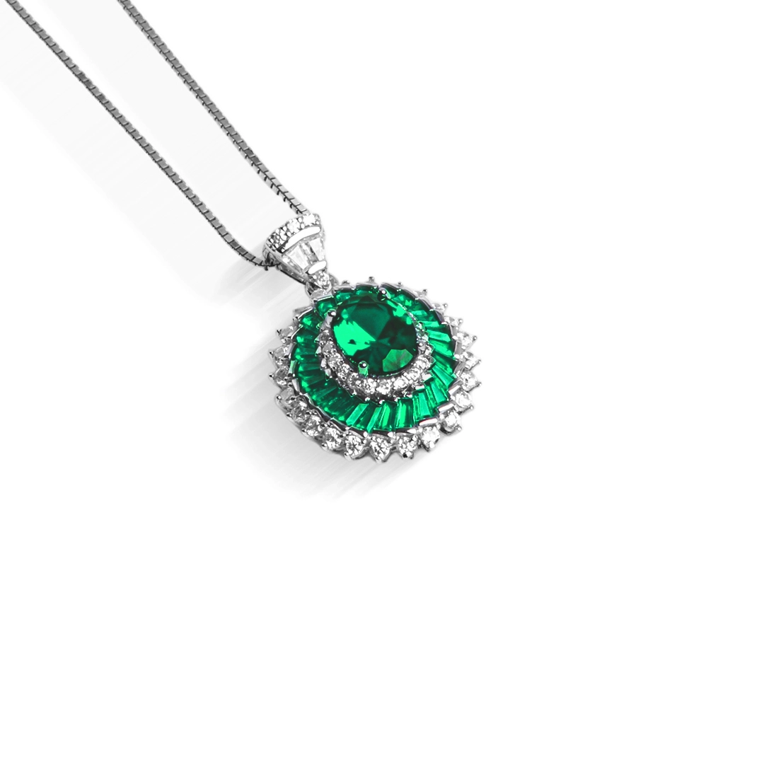 Gargantilha em malha veneziana com pingente em formato oval de zircônias esmeralda e zircônias cristal.