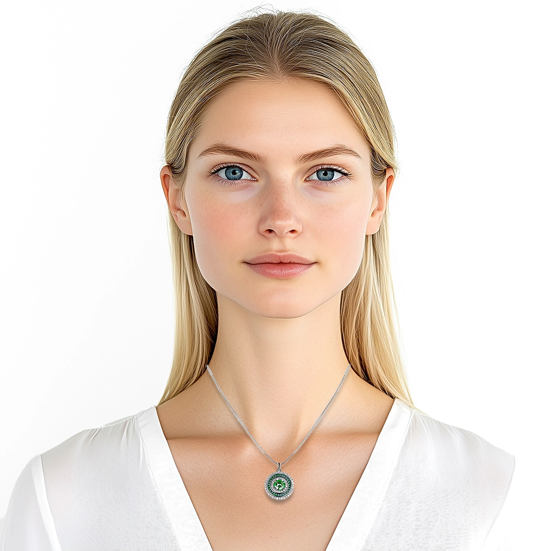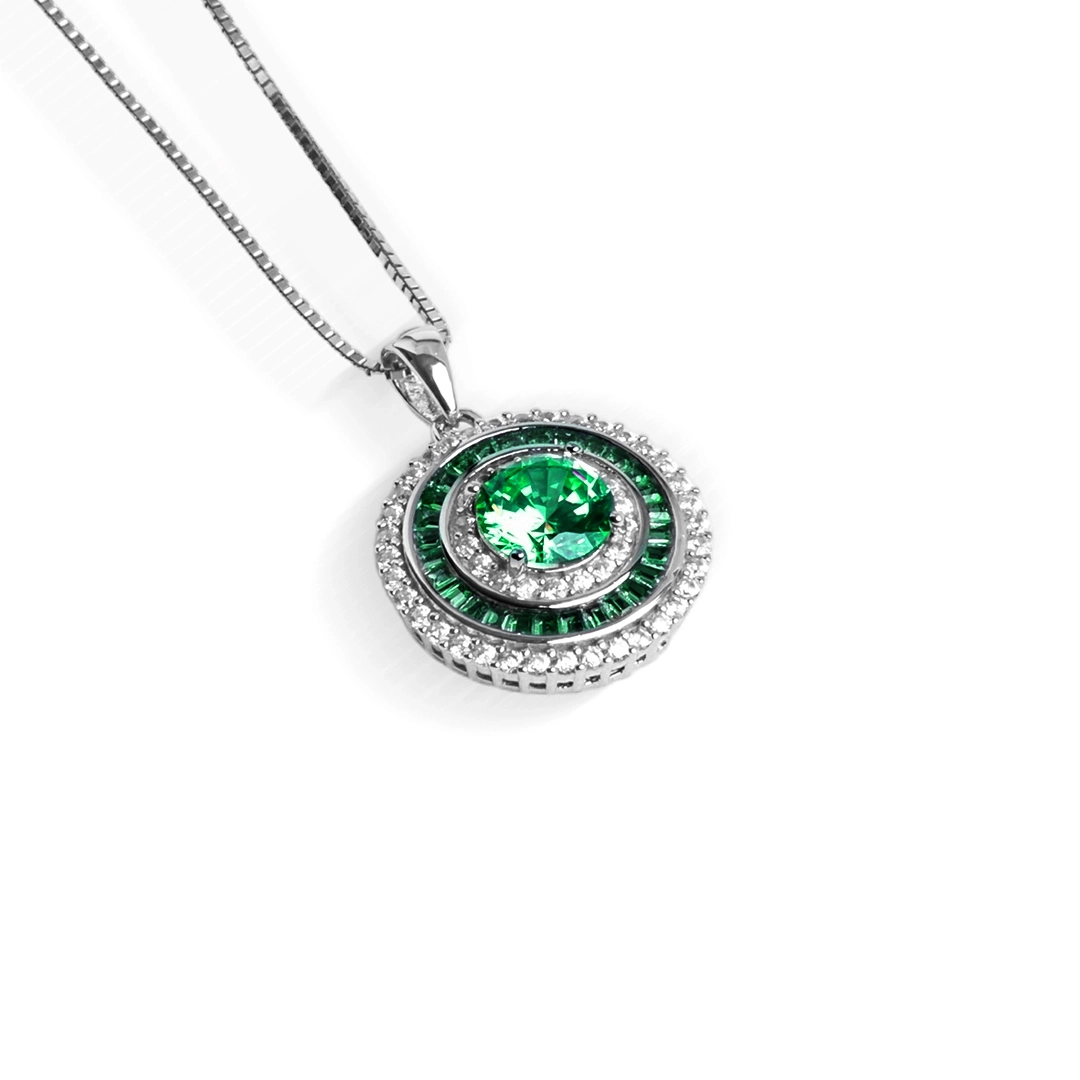 Gargantilha em malha veneziana com pingente em formato redondo de zircônias esmeralda e zircônias cristal.