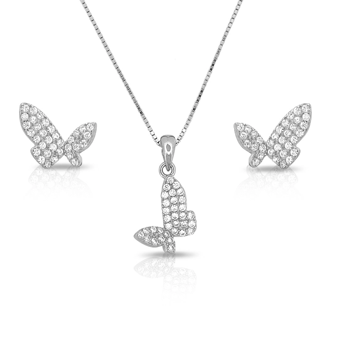 Gargantilha de Prata com Brincos Borboletas em Zircônias Cristal