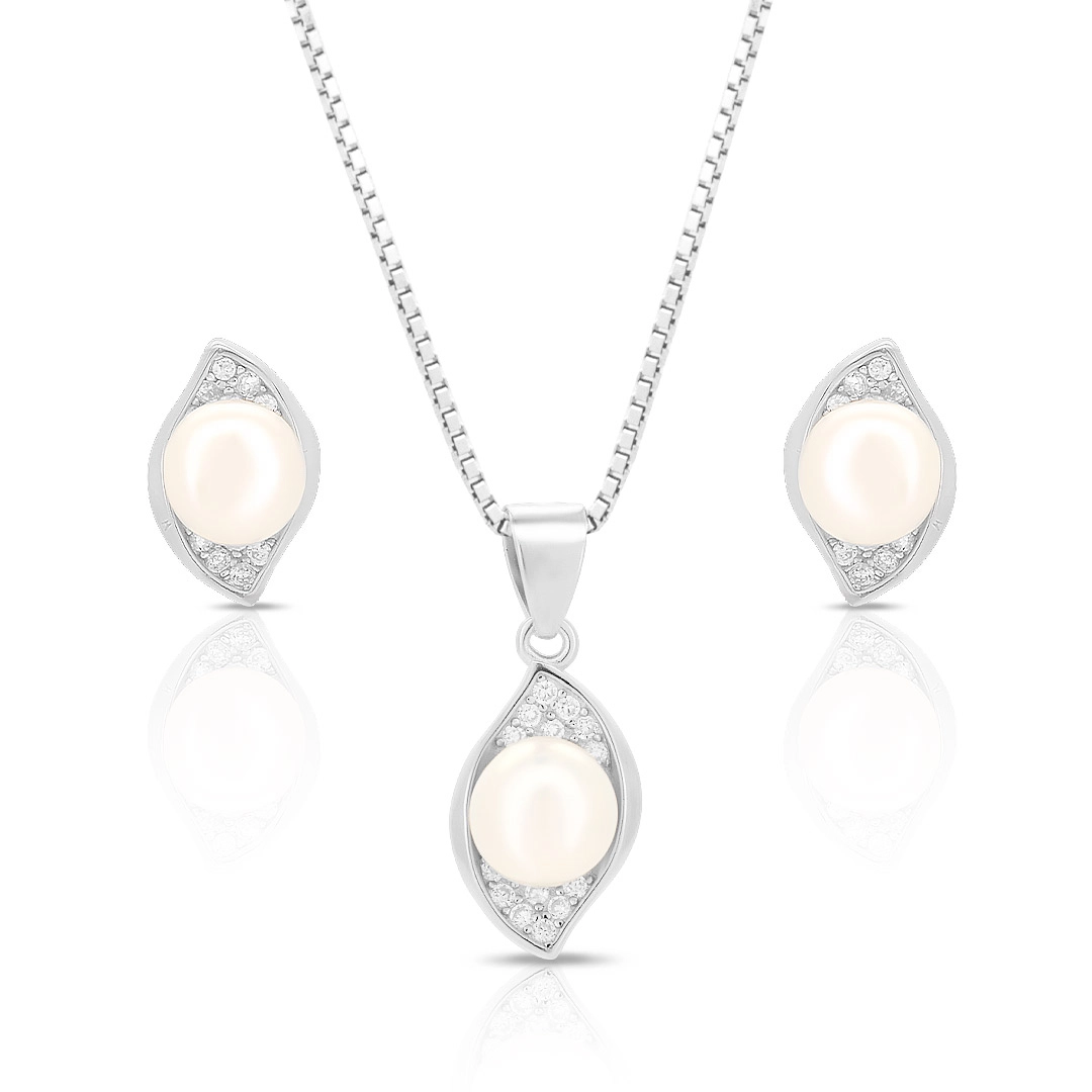 Gargantilha de Prata com Brincos Top e Pingente com Pérola Biwa e Zircônia Cristal