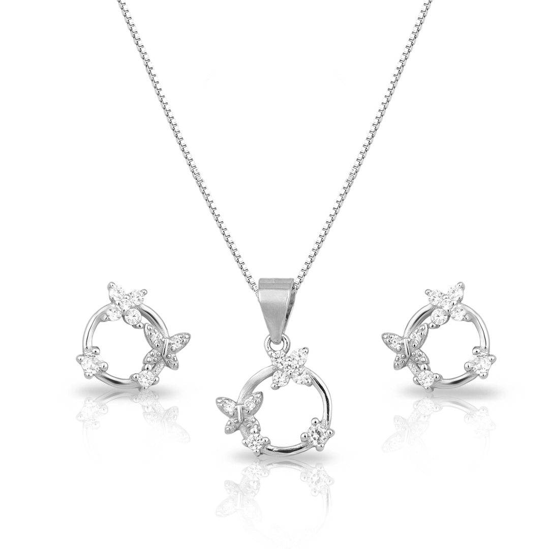 Gargantilha de Prata com Brincos Top e Pingente de Borboletas com Zircônia Cristal