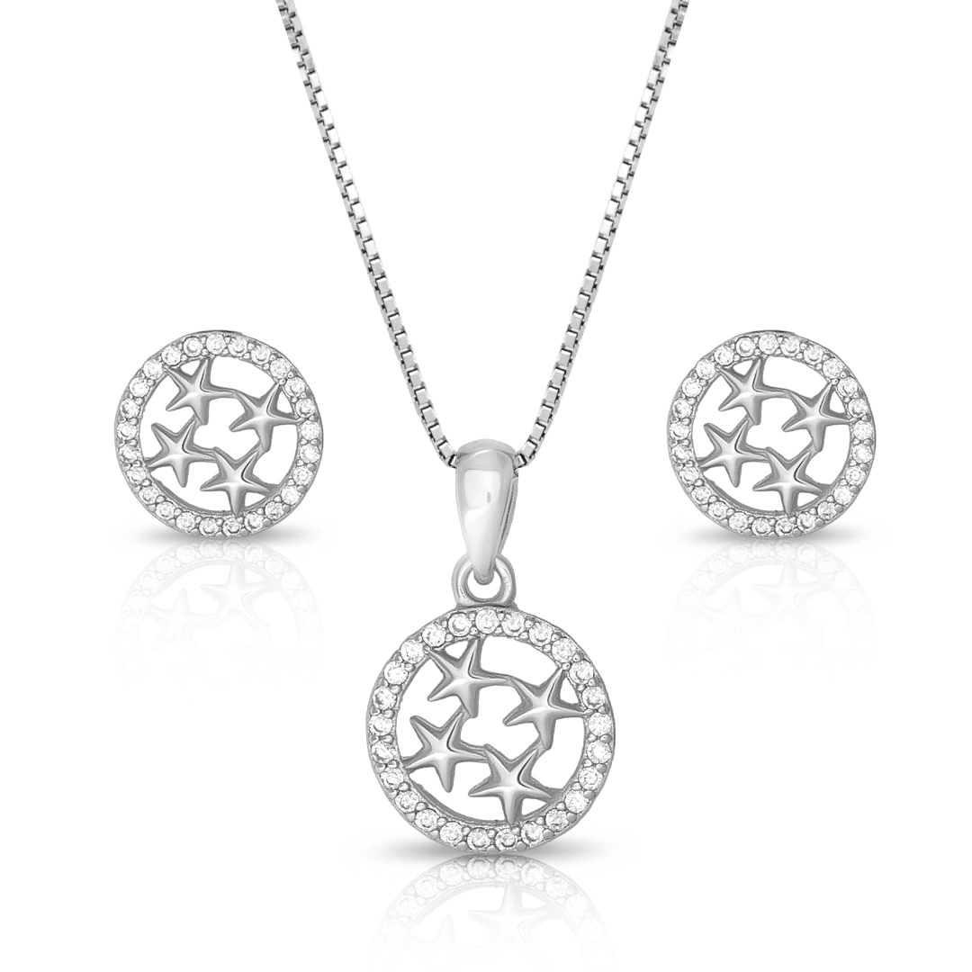 Gargantilha de Prata com Brincos Top e Pingente de Estrelas Espelhadas