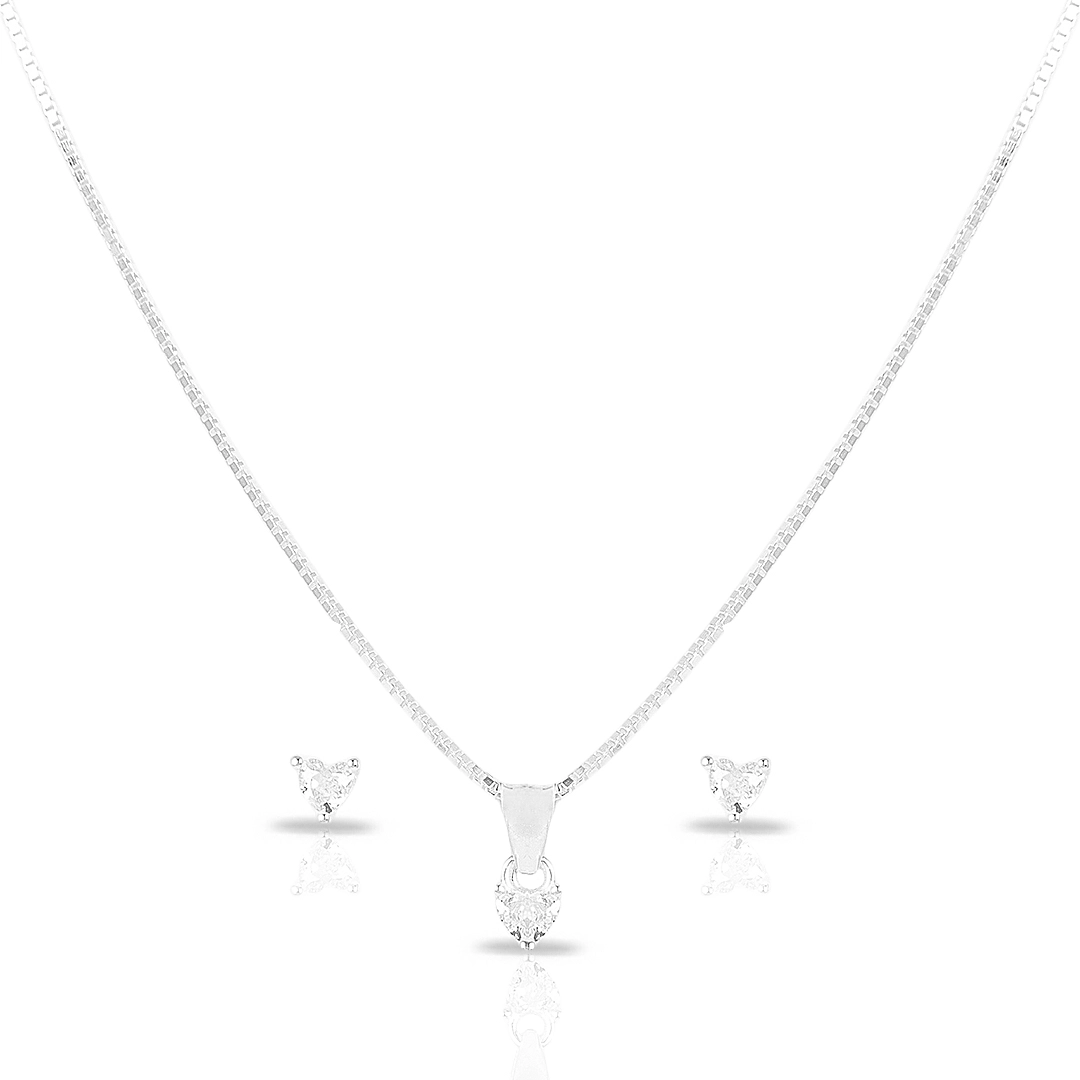 Gargantilha de Prata com Brincos Top e Pingente Ponto Luz de Coração em Zircônia