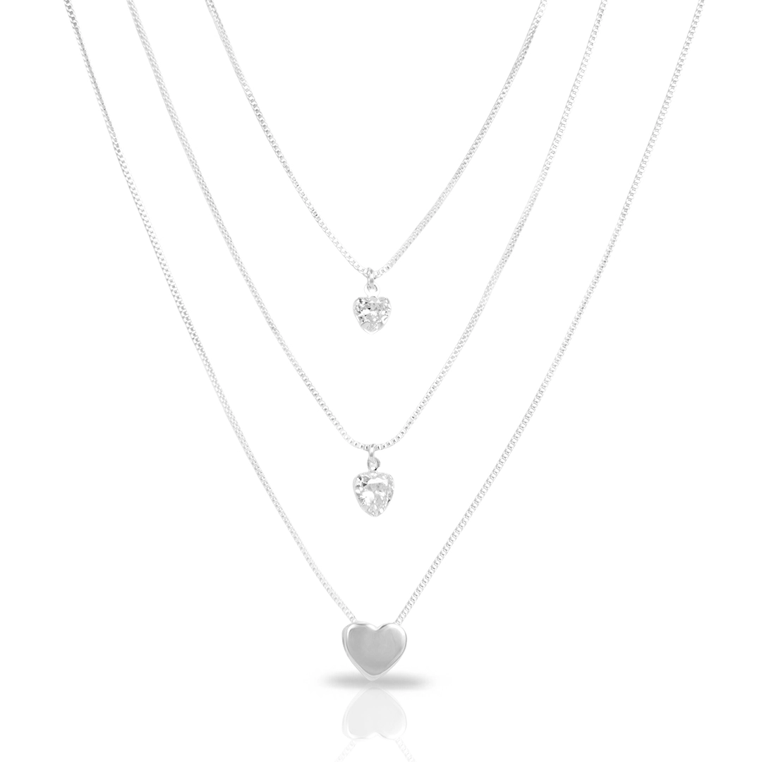 Gargantilha De Prata Leve Tripla Com Chapa de Coração e Zircônias Cristal