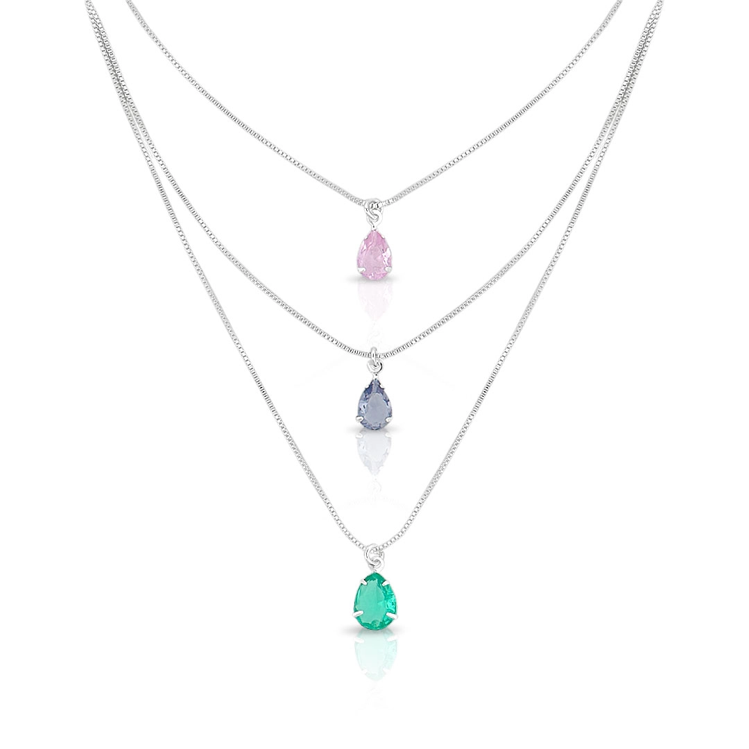 Gargantilha De Prata Leve Tripla Com Zircônias Coloridas Gota