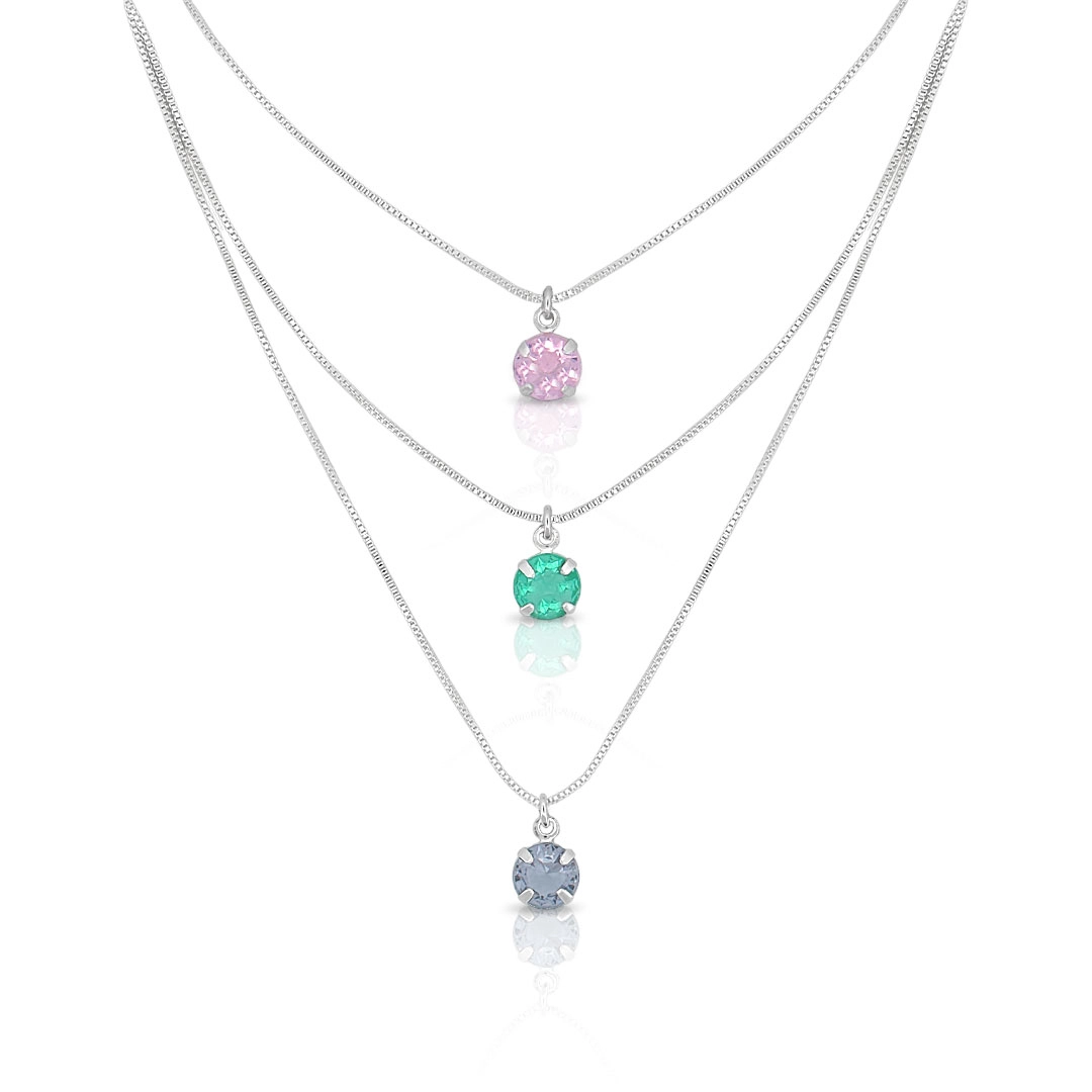 Gargantilha De Prata Leve Tripla Com Zircônias Coloridas Redondas