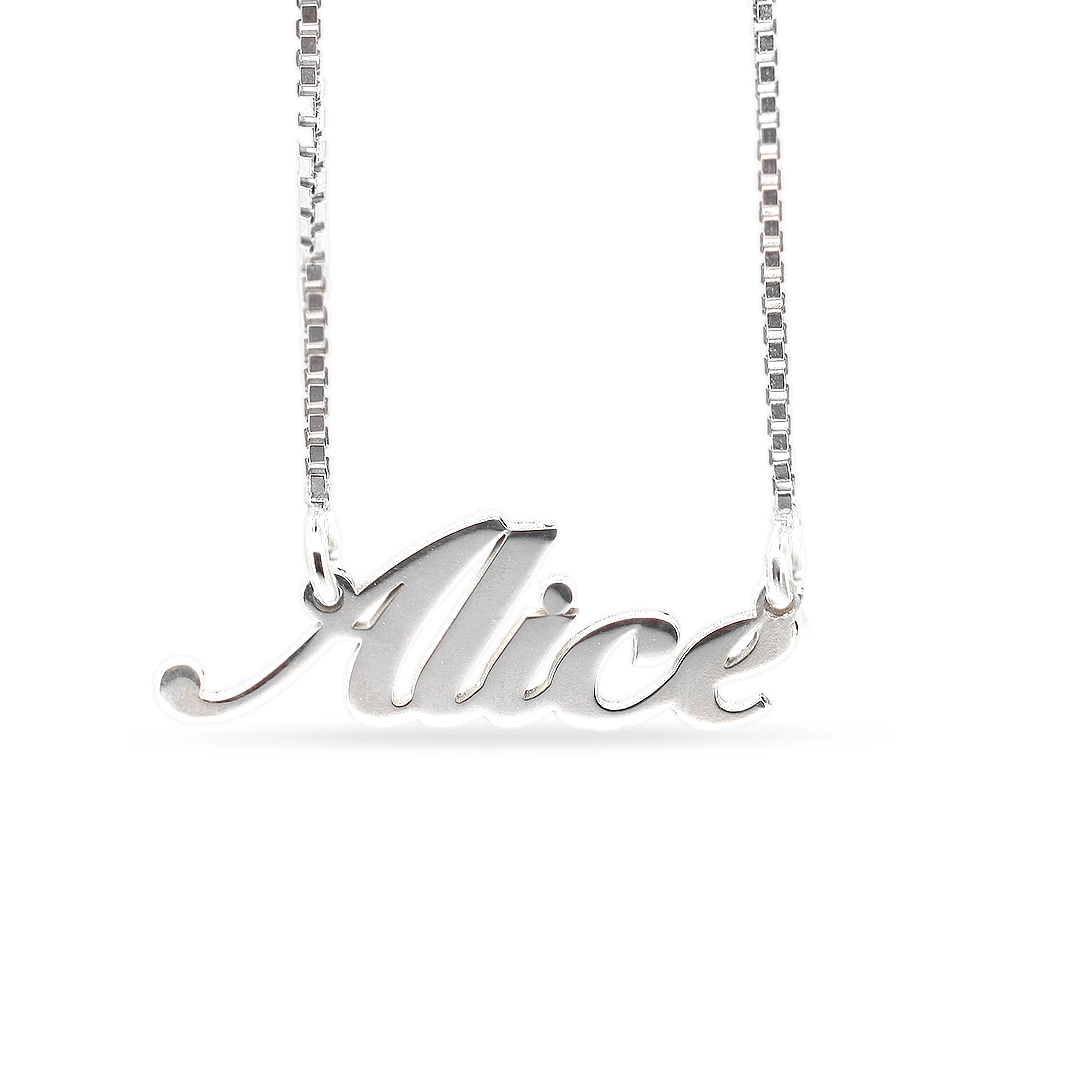 Gargantilha nome com pingente a laser e corrente em malha veneziana com acabamento em ródio.