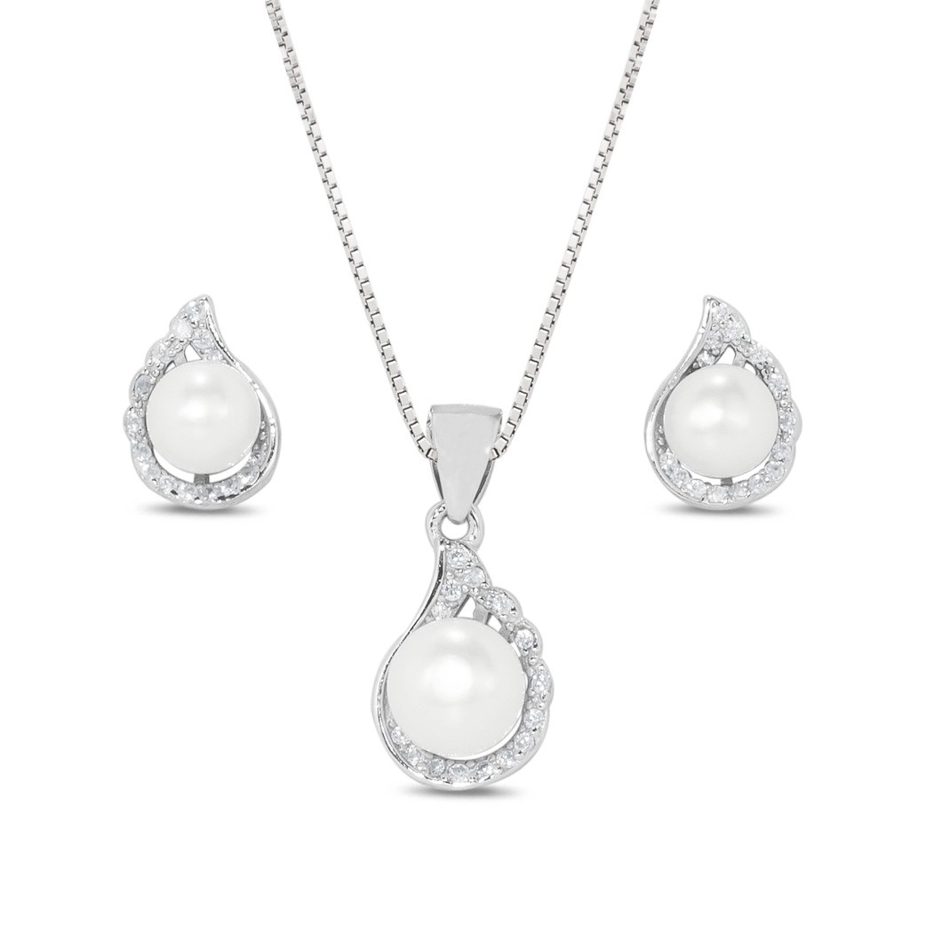 Gargantilha de Prata Top com Brincos e Pingente com Pérola Biwa e Zircônia Cristal