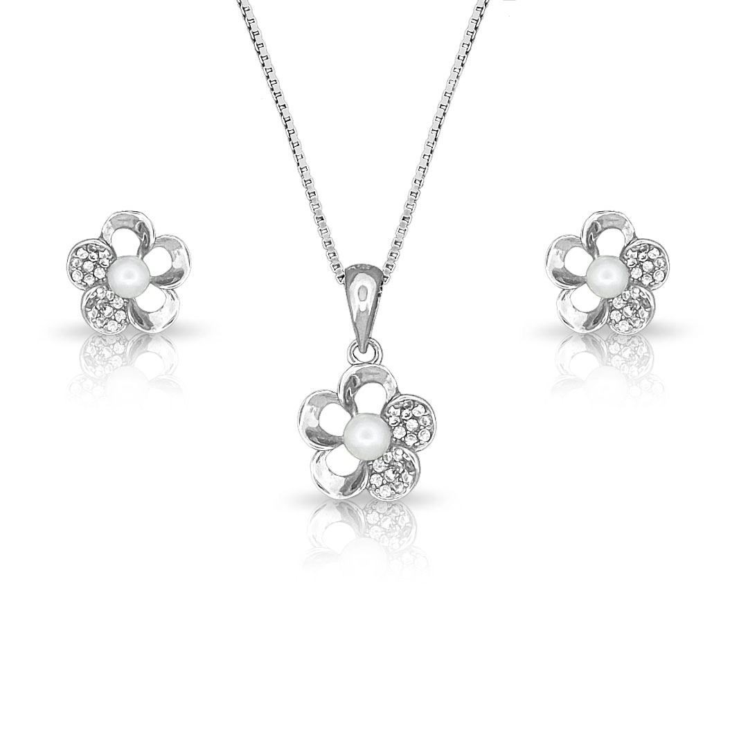 Gargantilha de Prata Top com Brincos e Pingente Flor com Pérola Biwa