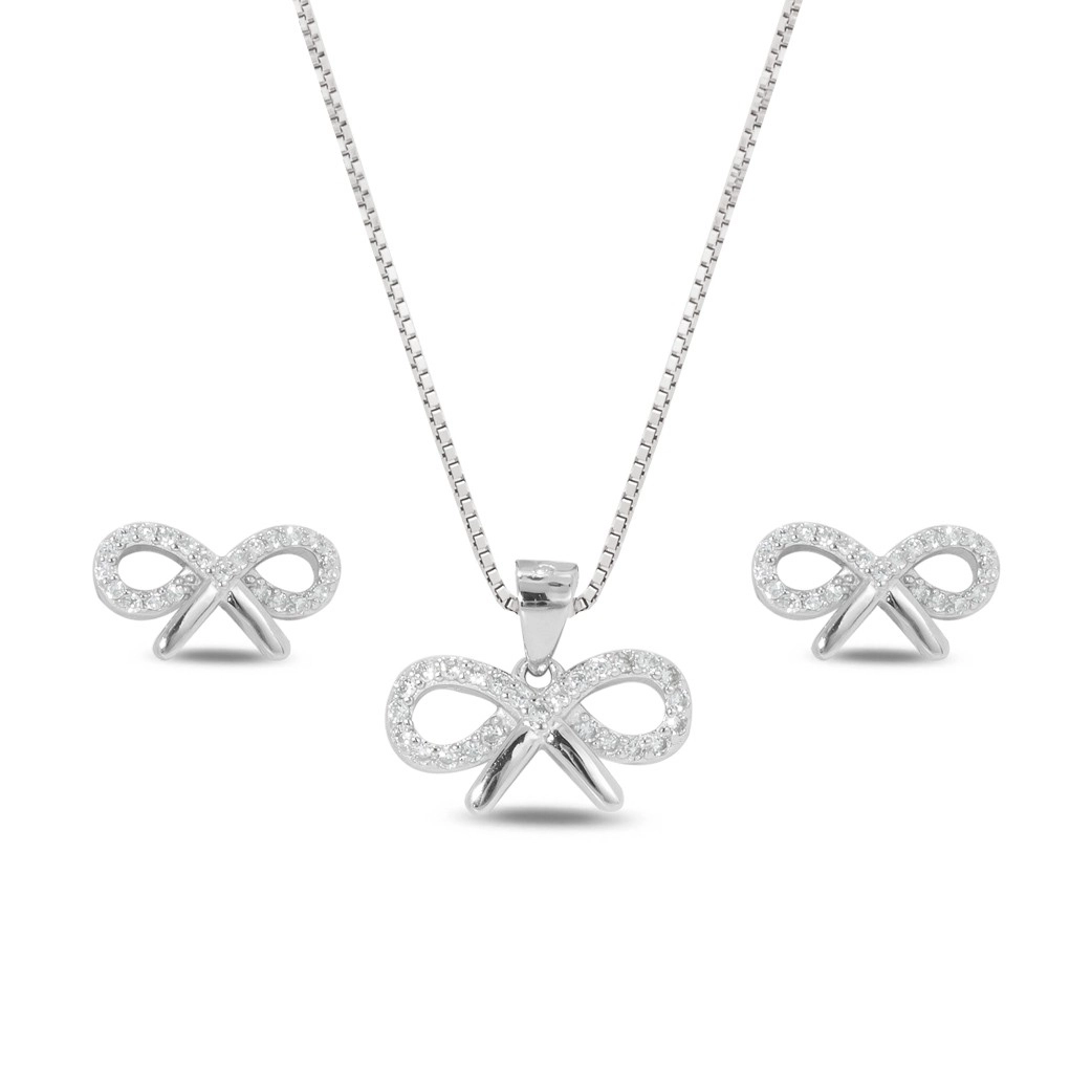 Gargantilha de Prata Top com Brincos e Pingente Laço de Zircônia Cristal