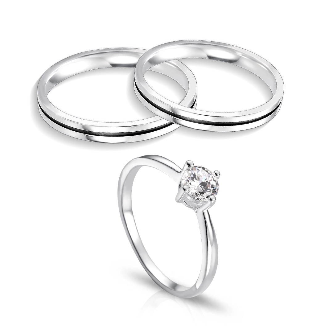 Kit de Alianças em Prata com Friso Envelhecido e Solitário
