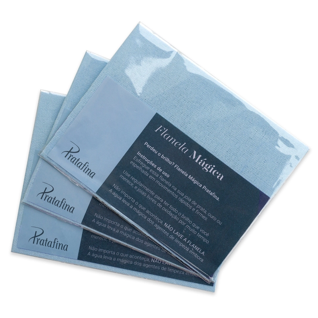 Kit de 3 Flanelas Mágicas com química especial que realça o brilho de peças de prata ou ouro com superfície lisa. Indispensável para limpar prata e manter a beleza das joias.