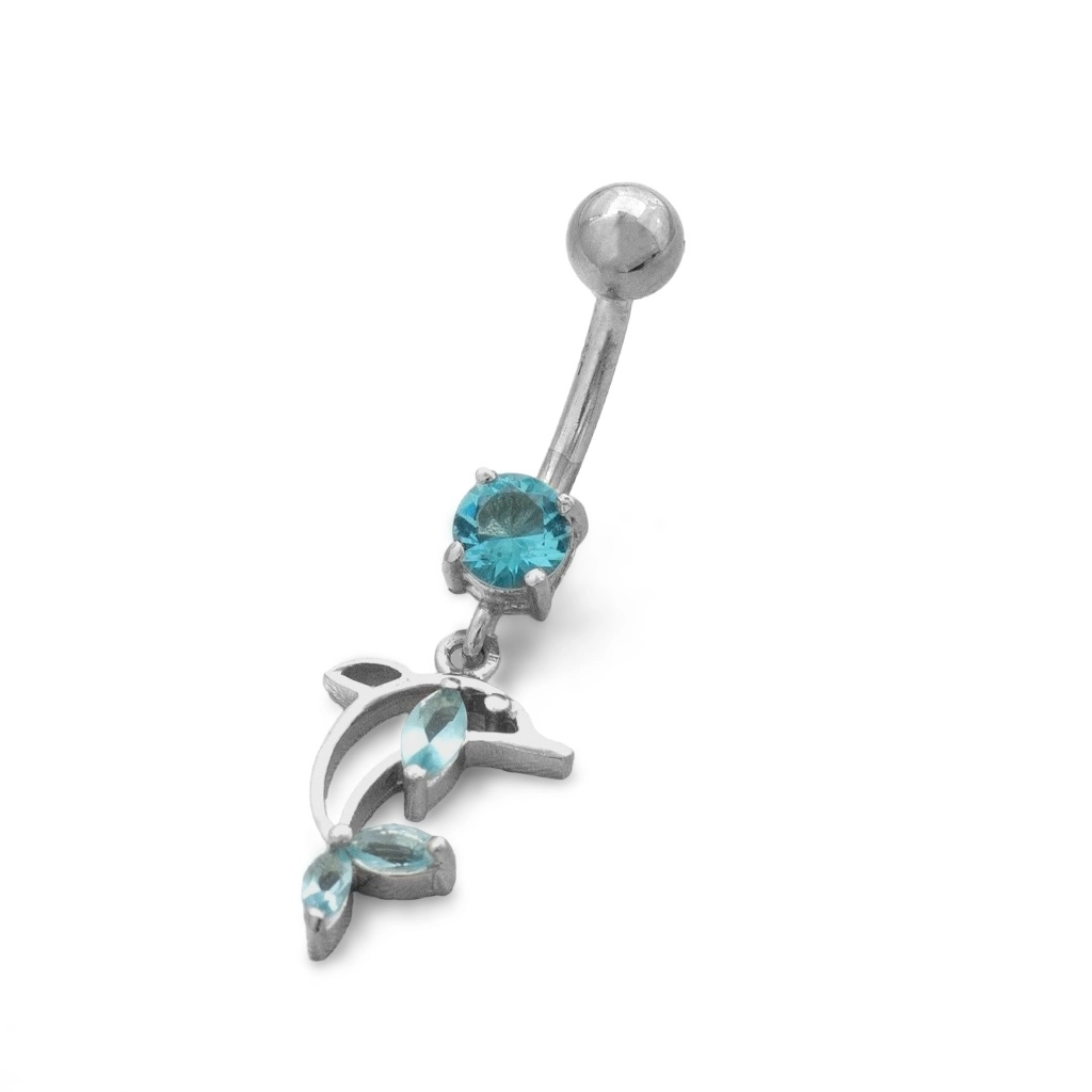 Piercing de zircônia água marinha redonda e golfinho vazado, sendo a haste em aço e o pingente em prata.