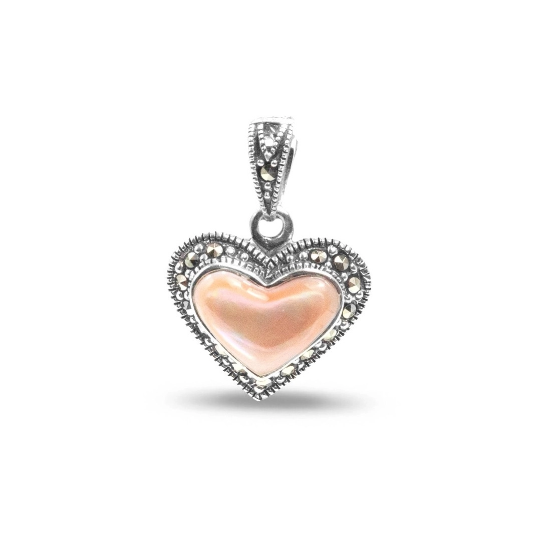 Pingente de Prata Envelhecido Coração com Marcassitas e Madrepérola Rosa