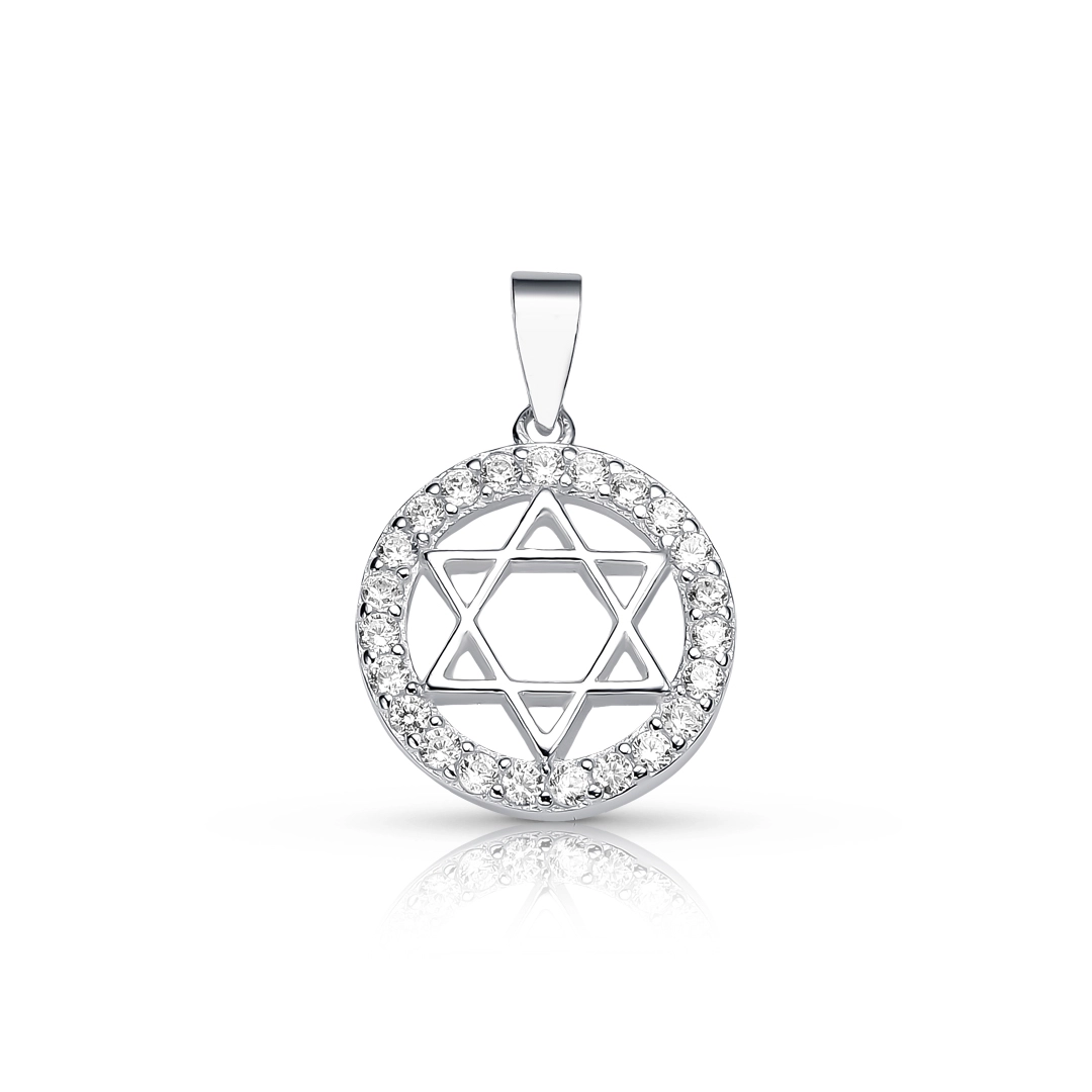 Pingente redondo com zircônias e Estrela de Davi vazada.
